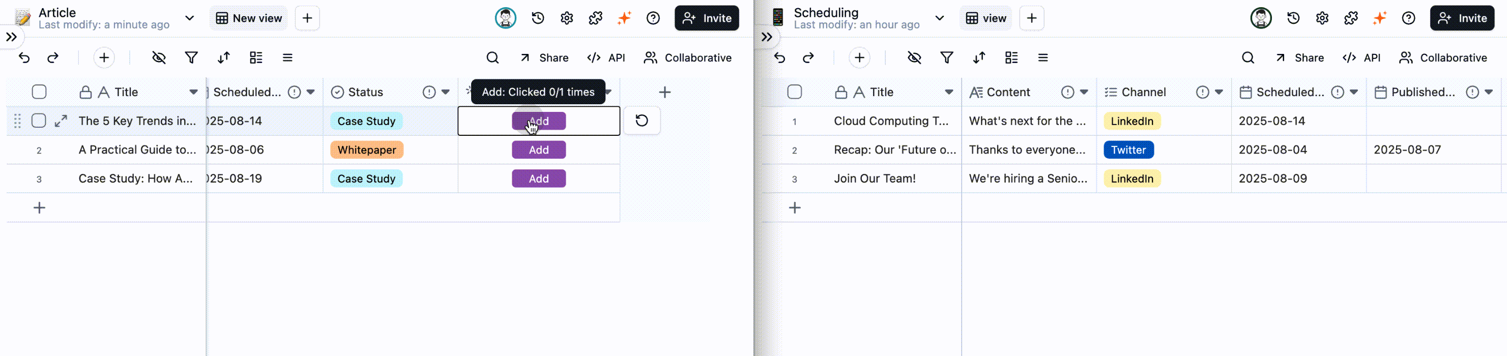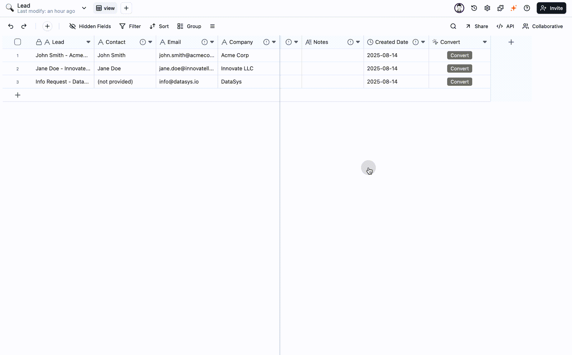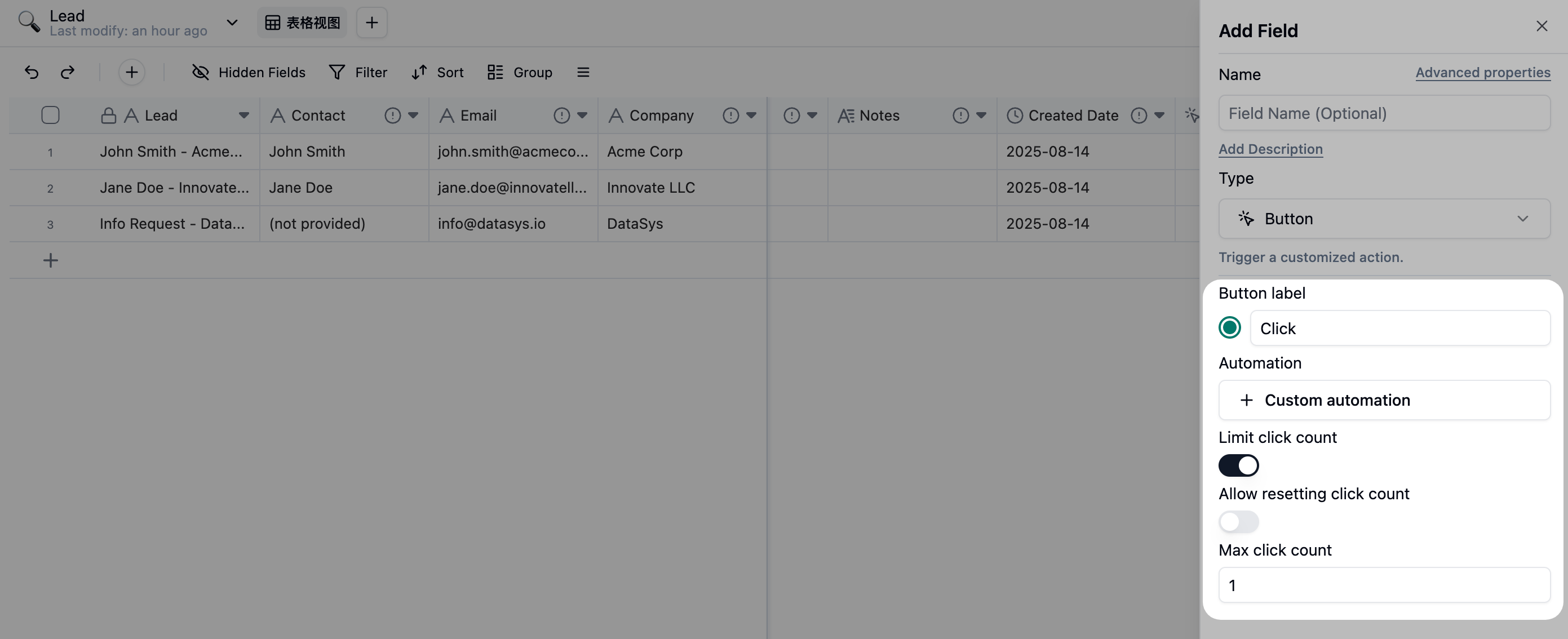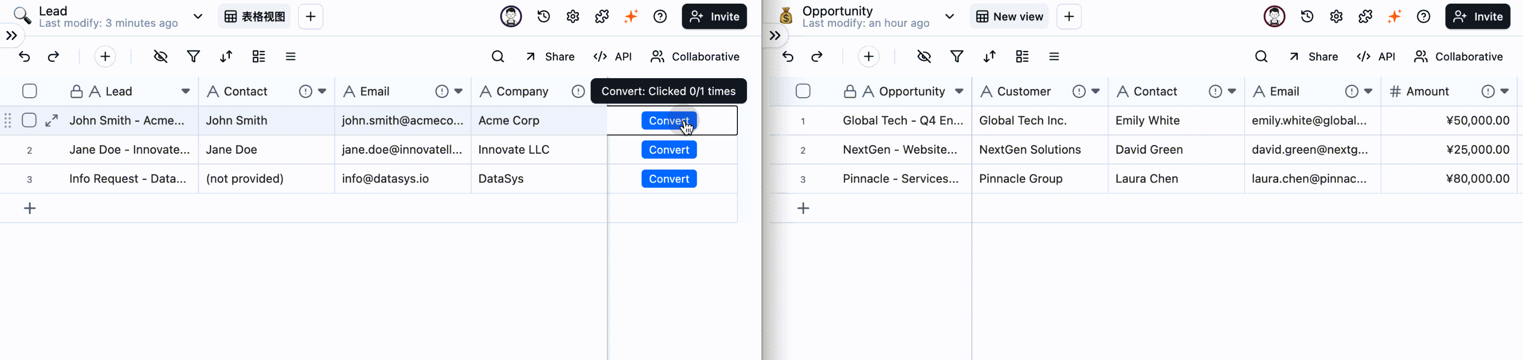 The core value of the Button field lies in its ability to connect and execute. It can link data within your tables and integrate with external systems, bundling a series of actions into a single click.Use Case 1: One-Click Lead Conversion