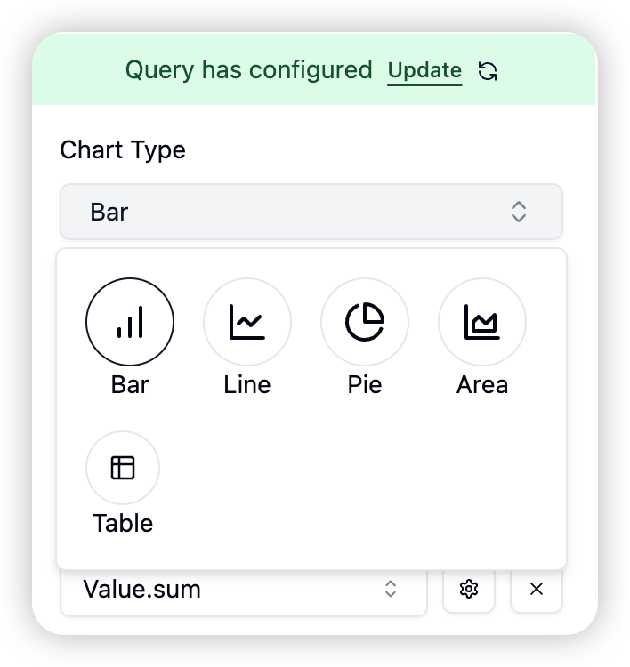 - Support for Bar/Line/Pie/Area/Table charts