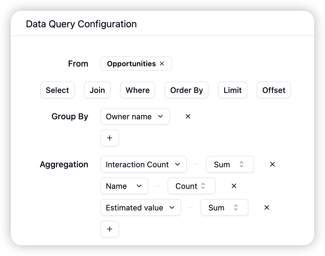 Support for selection/filtering/joining/sorting/grouping/aggregation query configurations