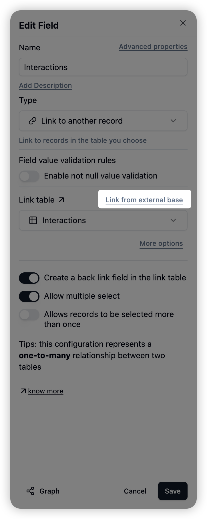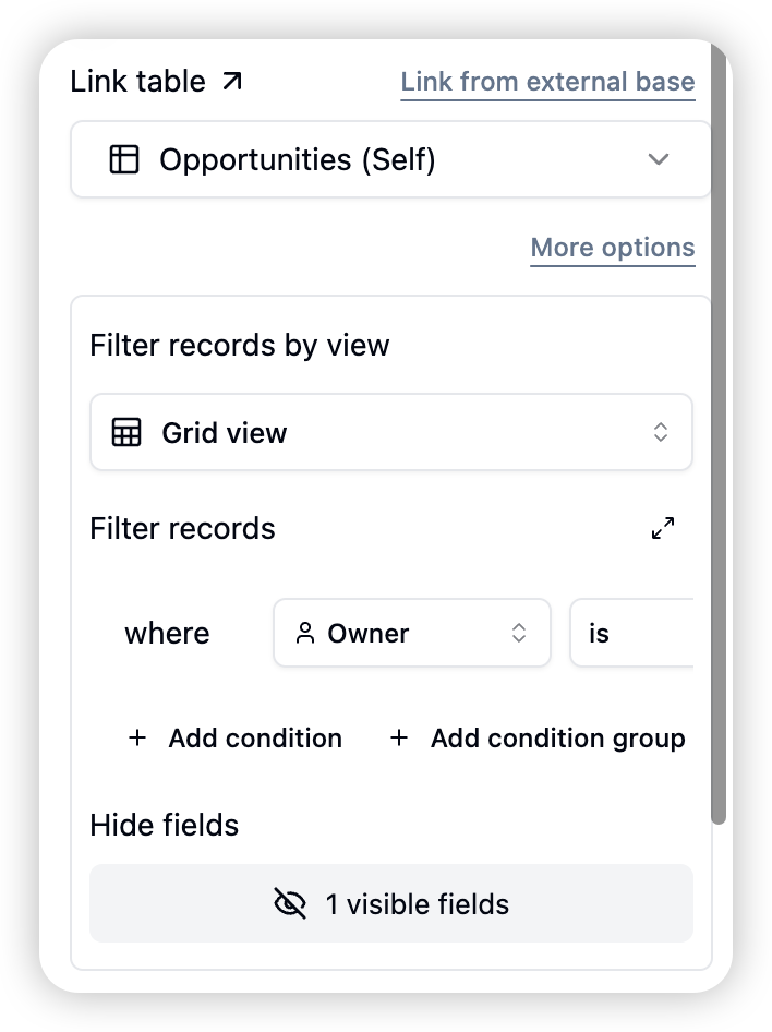 Comprehensive permission control prevents accidental data exposure through links! Control which view to link records from; control which filtered records can be linked; control which fields are visible in the linking selection list.