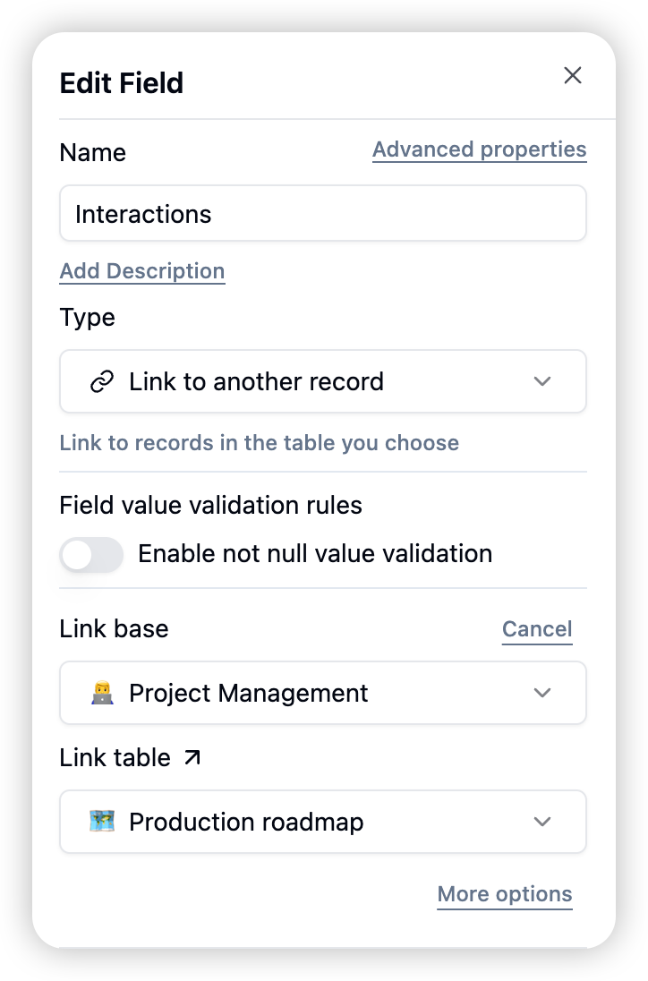- Example: Link from Project Management base to Product Task Management