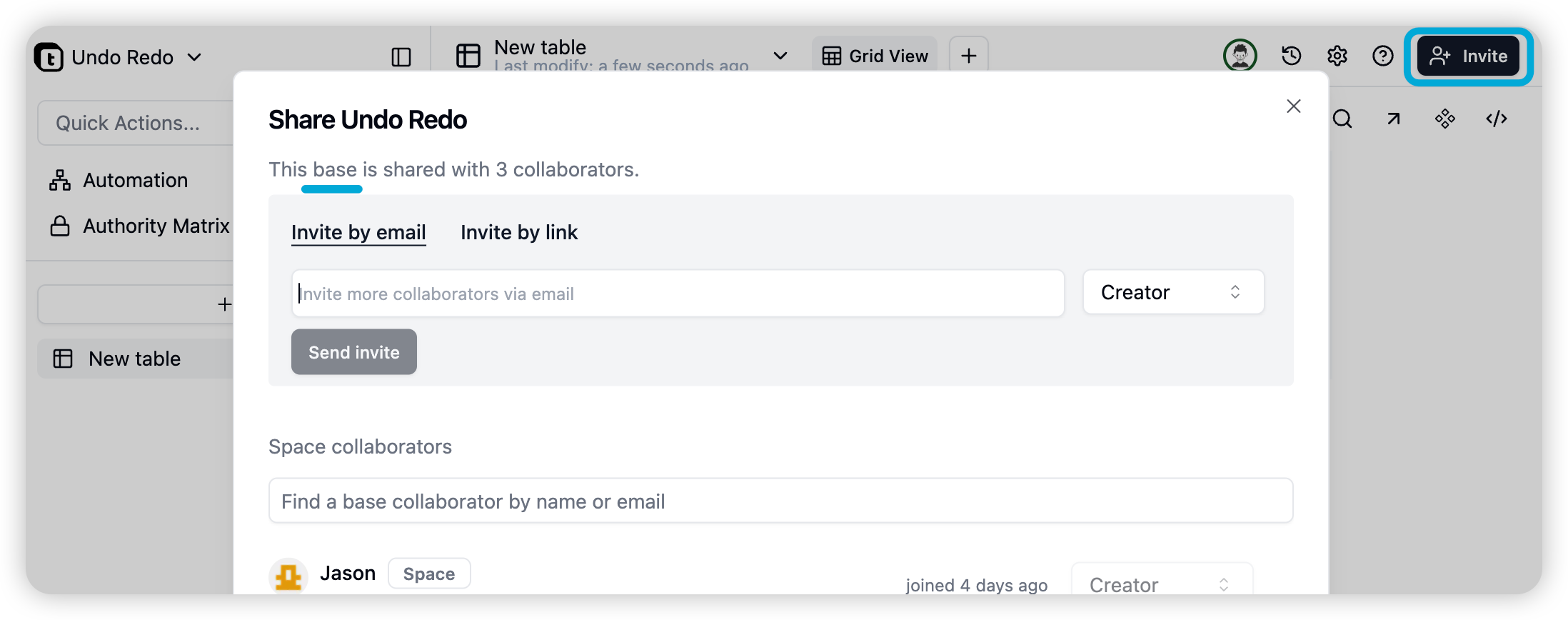 - Open the target table, click the “Share” button in the upper right corner