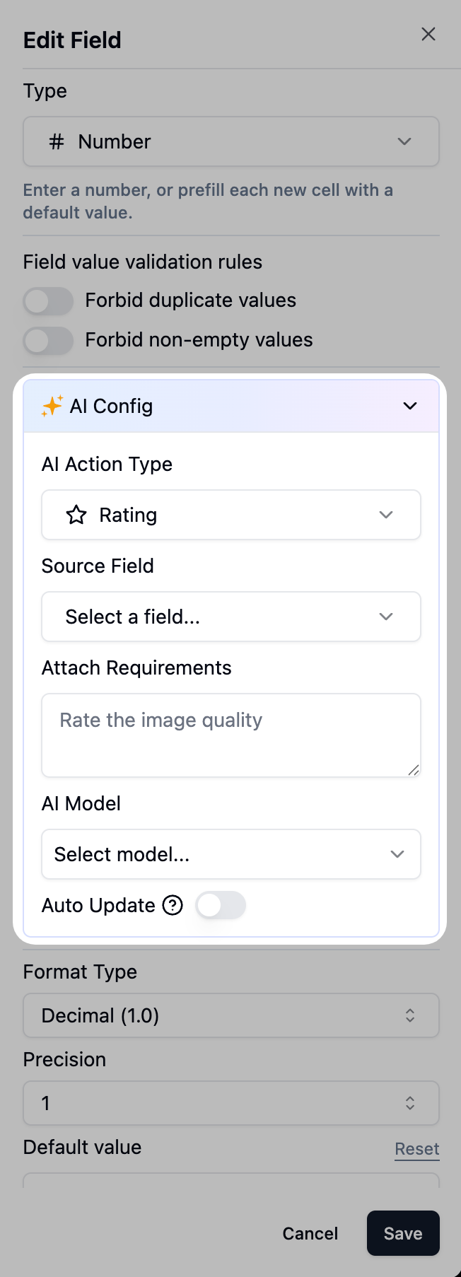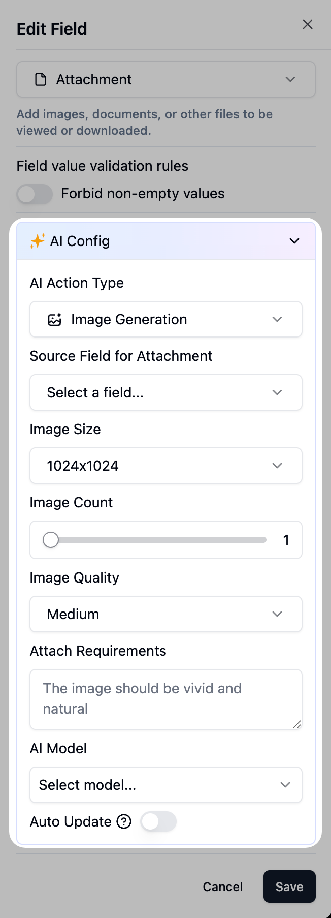 AI Field Configuration: Comprehensive AI configuration support for attachment, numeric, and other field types with improved interaction experience