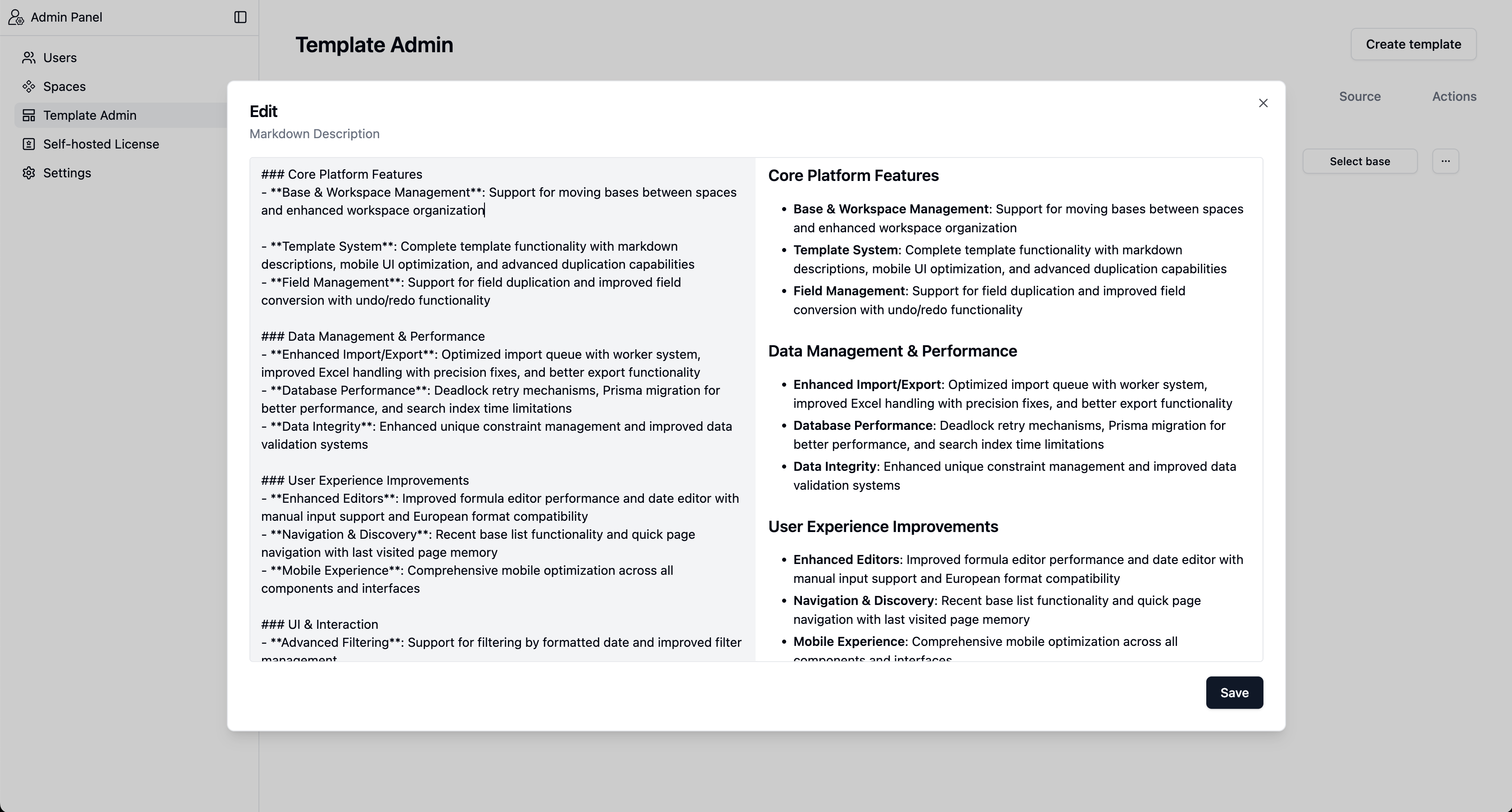 Navigate to Admin Panel > Template Admin to create a new template.You can select a base from any space, customize it with a cover image, and add a detailed description.