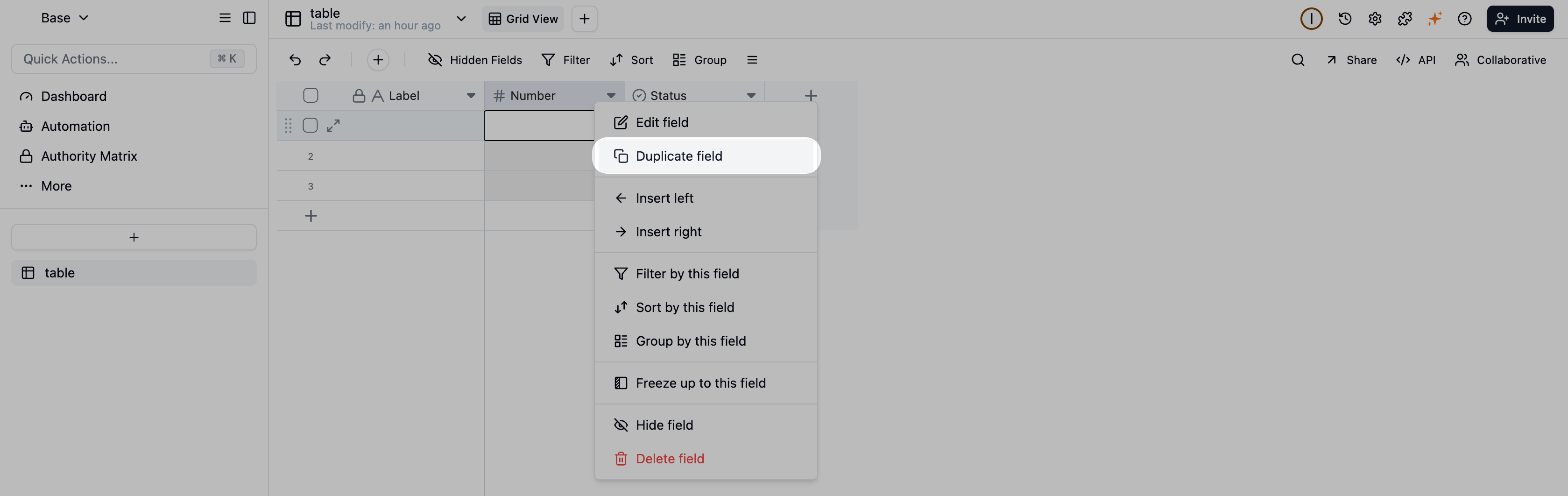 The Button field is a powerful interactive tool that transforms static rows of data into actionable units. With a single click, users can trigger pre-configured automations to handle internal data flows—like updating a record’s status or syncing data across tables—and even perform external actions, such as sending custom notifications or calling an external API. It also supports custom labels and colors, limits on clicks and resets, and allows read-only users to trigger actions.