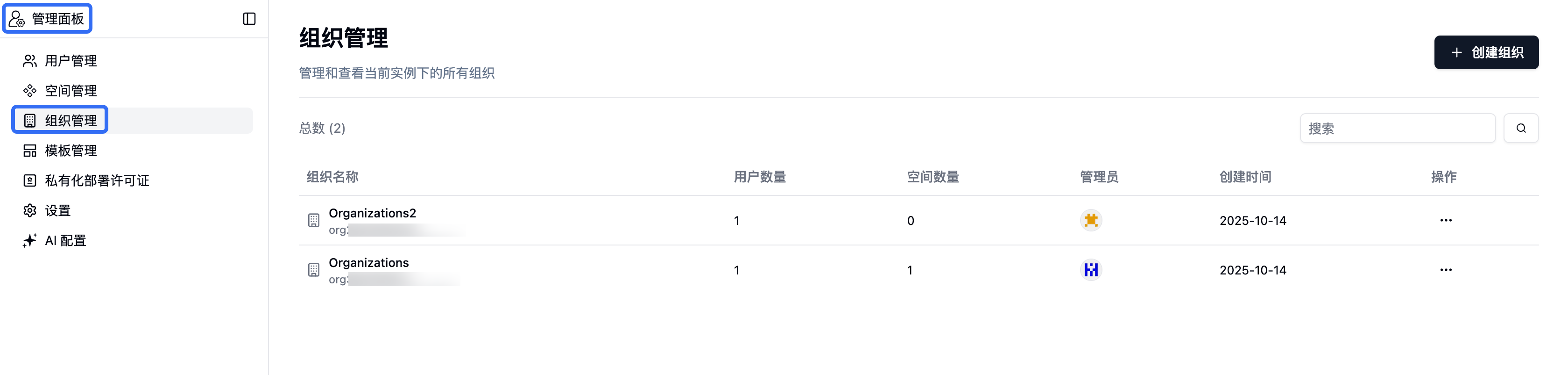 组织管理界面显示所有组织的详细信息,包括:- 组织名称:组织的名称
