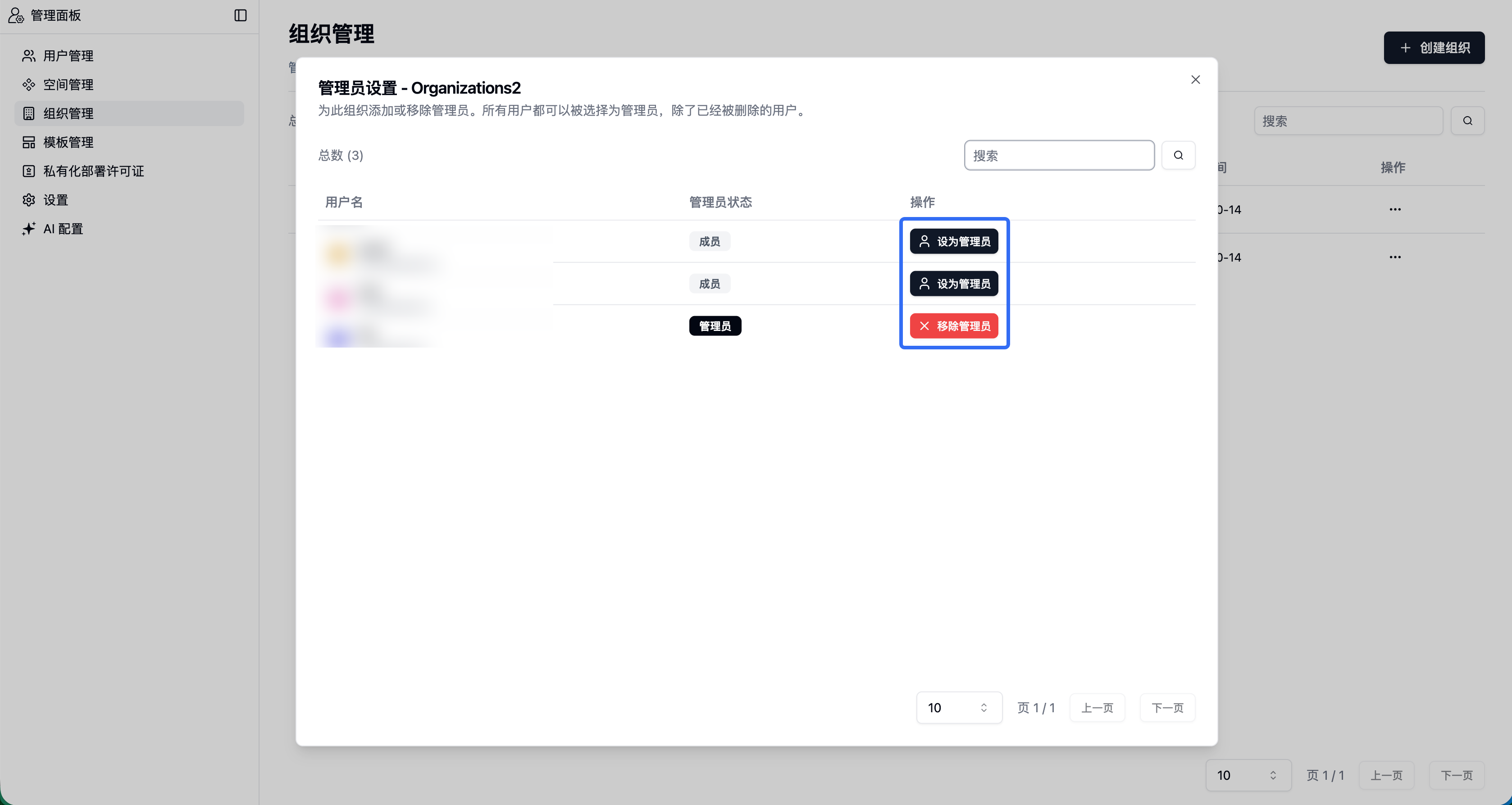 - 设置/移除组织管理员权限