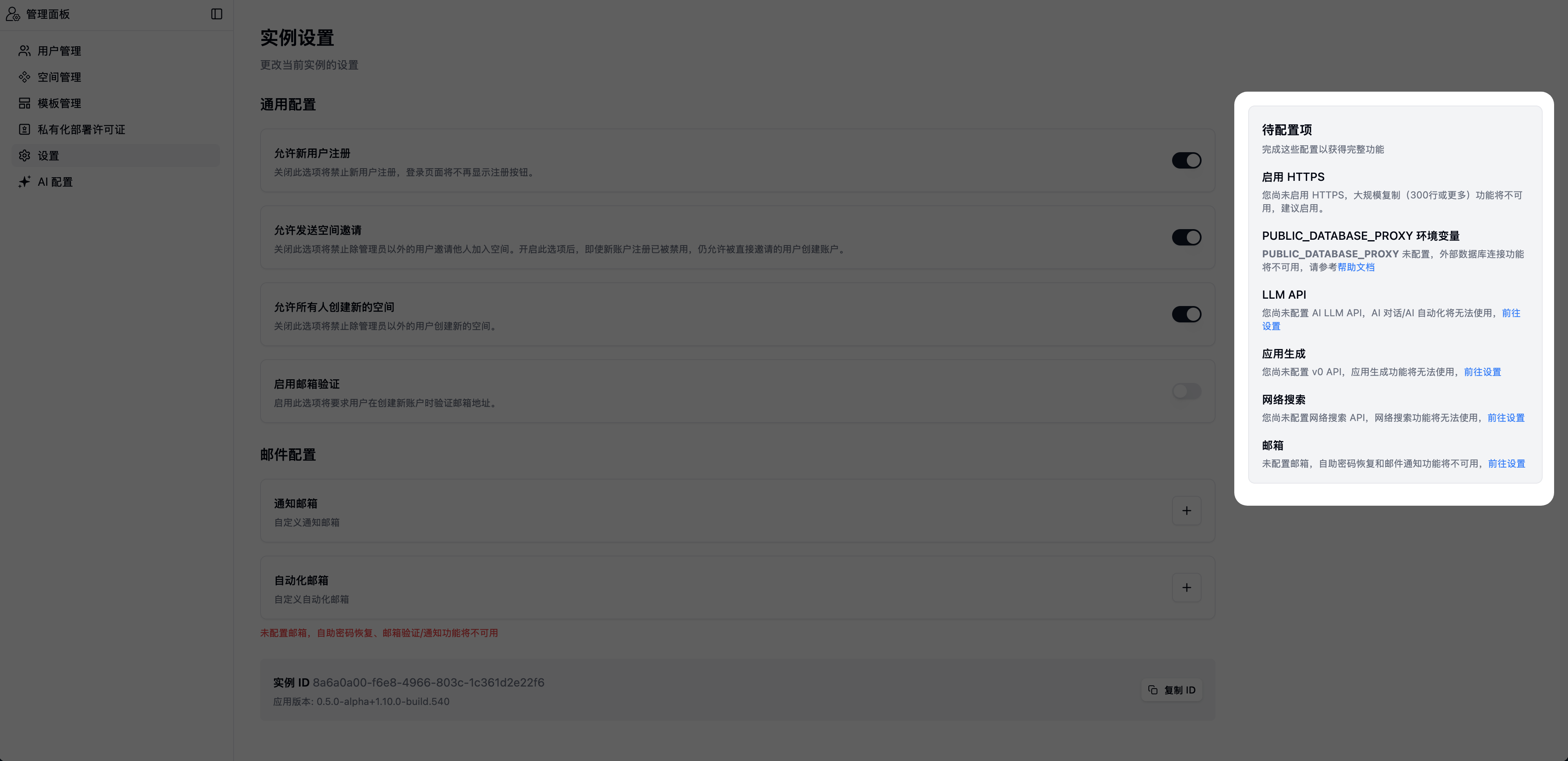 右侧的「待配置项」卡片会提示需要完成的重要系统级配置,以确保各项功能可以正常使用。