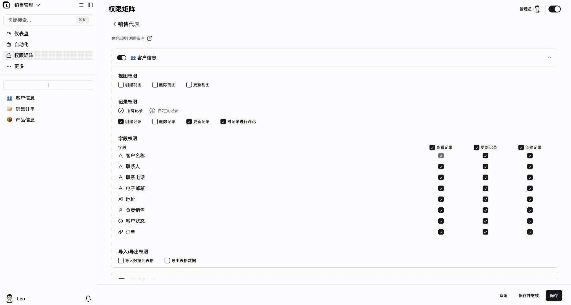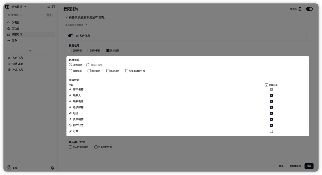 在标准的权限设置中,我们通常让销售代表只能看到自己的客户。但在实际工作中,团队需要协作和学习。比如,在每周的销售复盘会上,我们希望销售代表能看到所有同事的客户信息以学习经验,但同时必须保证,他们只能编辑和维护自己的客户。 以下是如何通过权限矩阵实现这一精细化管理: 目标:实现思路: 这是一个非常巧妙且常用的管理方法:我们不改变现有