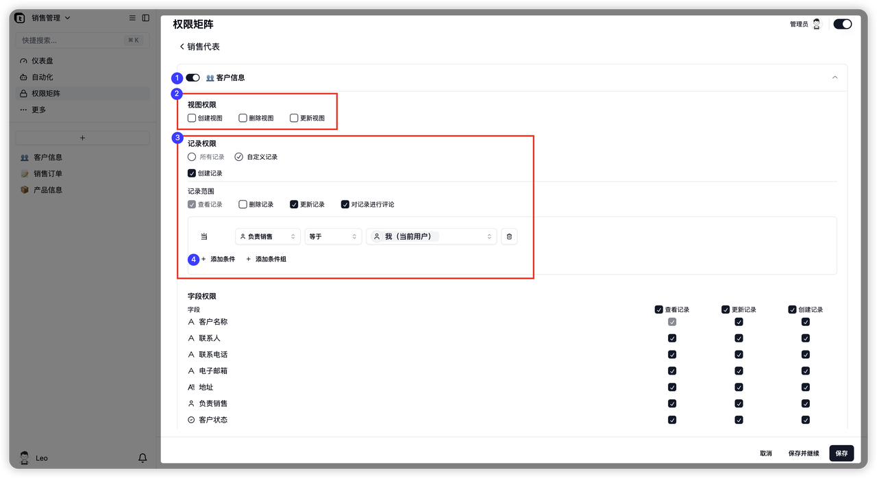 销售代表角色只能修改或删除自己名下的客户记录。销售代表角色的权限,而是创建一个全新的、专门用于“观察”的角色。这需要我们的权限系统支持对【查看】、【更新】、【删除】等不同操作,应用不同的筛选条件。 配置步骤:第一步:创建一个新的“观察员”角色