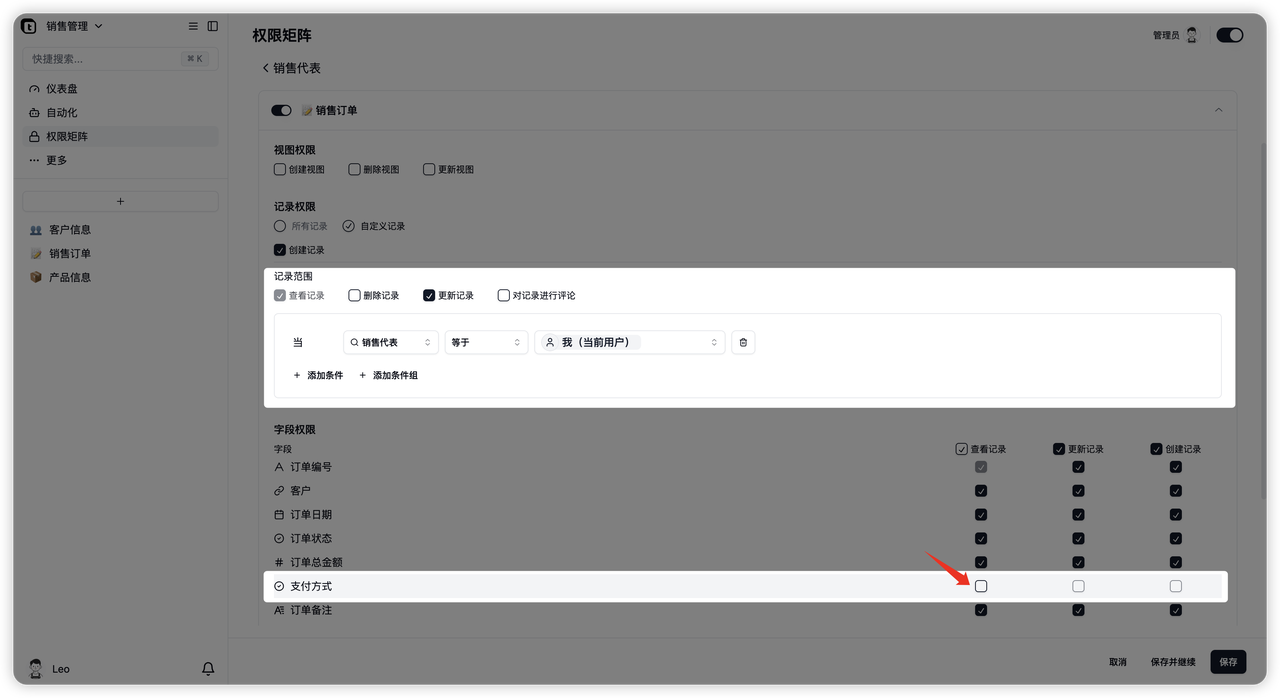 查看记录、创建记录。为了防止已成交订单被修改,可以不勾选更新记录和删除记录。 - 字段权限:我们不希望销售代表看到订单的“支付方式”,可以找到
