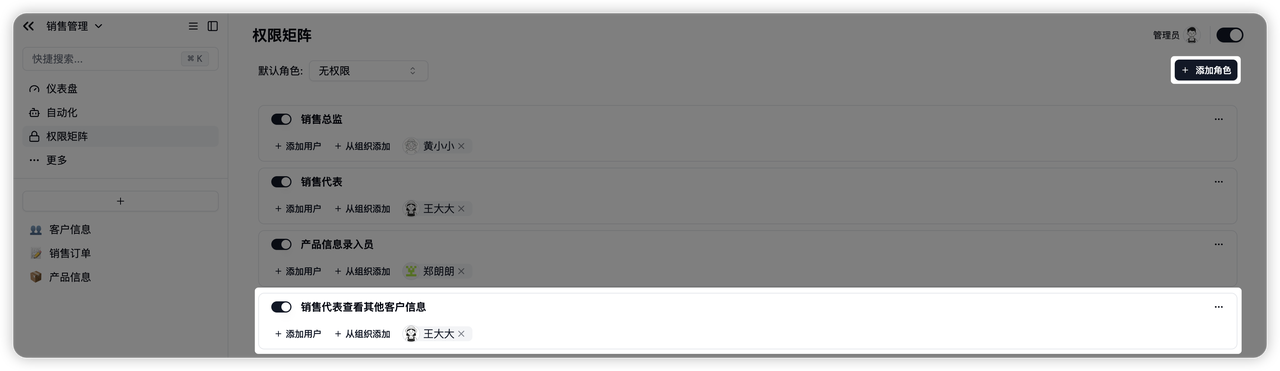 全局客户观察员角色旁的+ 添加用户按钮,将销售代表(如“王大大”)加入。最终效果: 配置完成后,当销售代表 “王大大” 登录系统时: