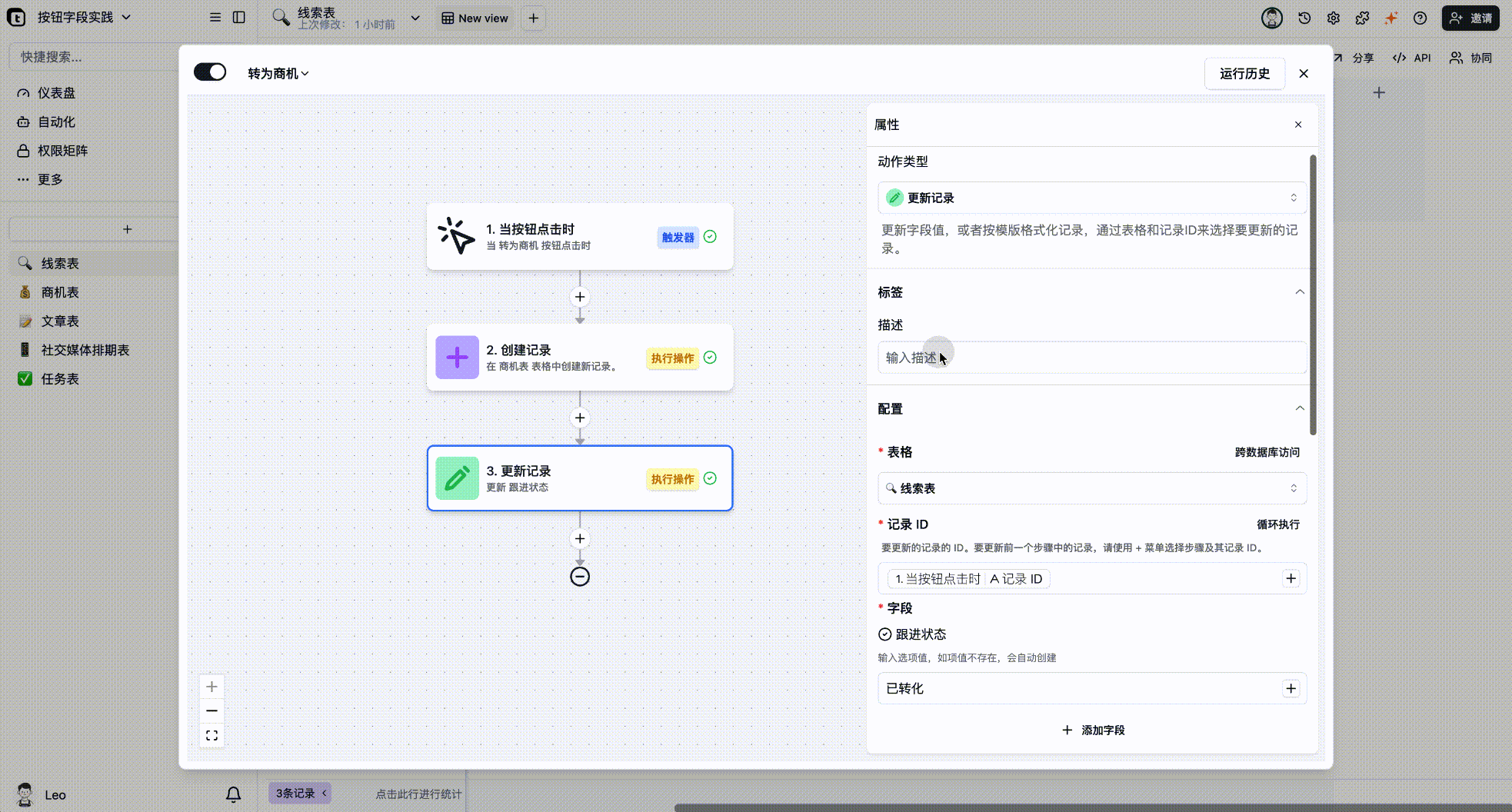 按钮字段的核心价值在于连接与执行。它可以连接表格内部的数据,也能连接外部的系统和服务,并将一系列操作封装成一次点击。场景1:线索一键转商机
