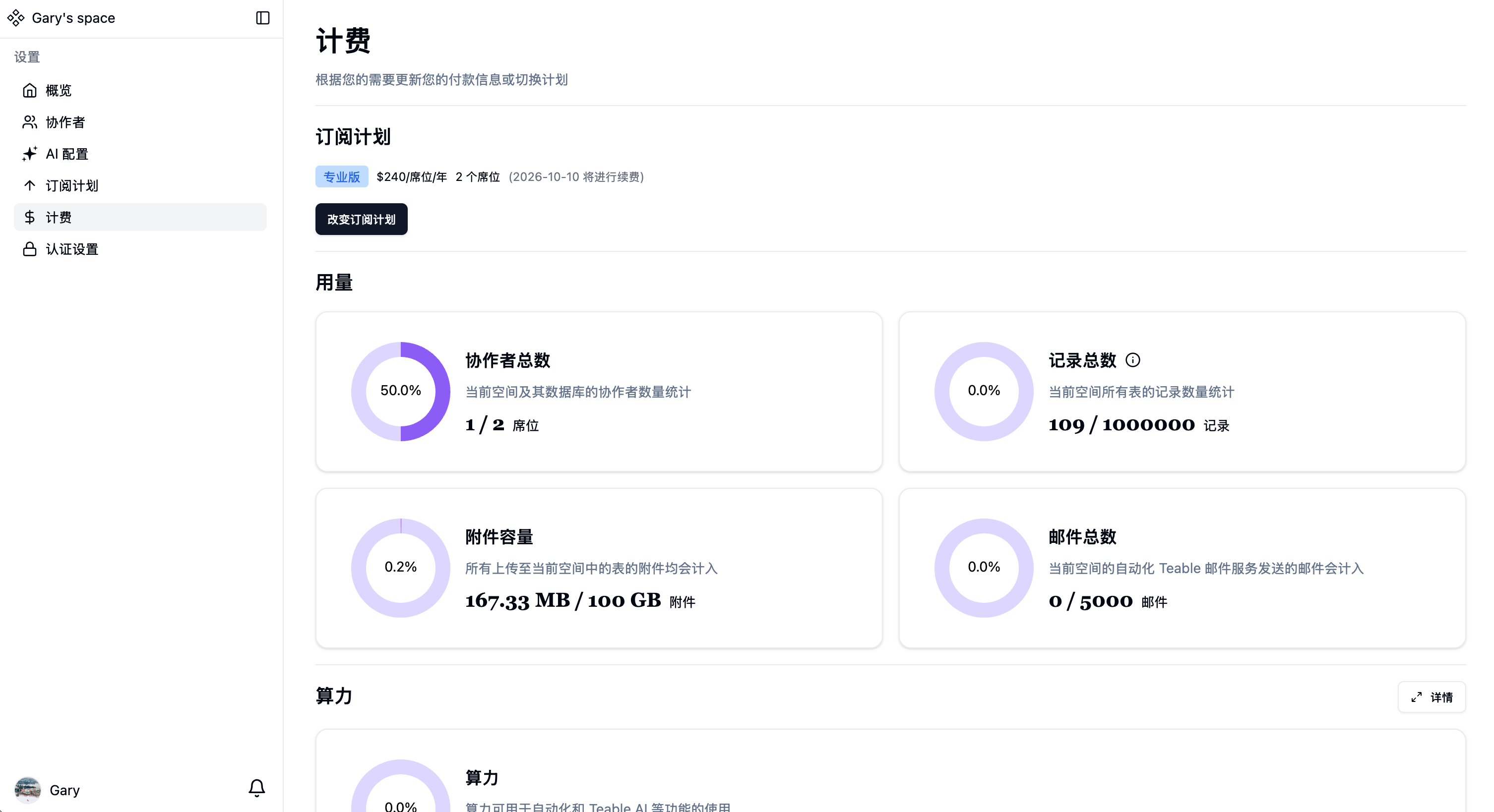 算力被 AI 功能消耗,包括自动化 AI 操作、AI 字段生成、AI 对话和应用构建器。每个计划都包含每月的算力配额。